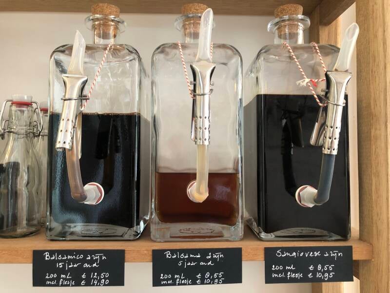 De olie en azijn kan worden verkocht in een eigen meegebrachte fles of een een mooie keramische fles van een Susann Weisse. De flessen worden handgemaakt in Kampen.